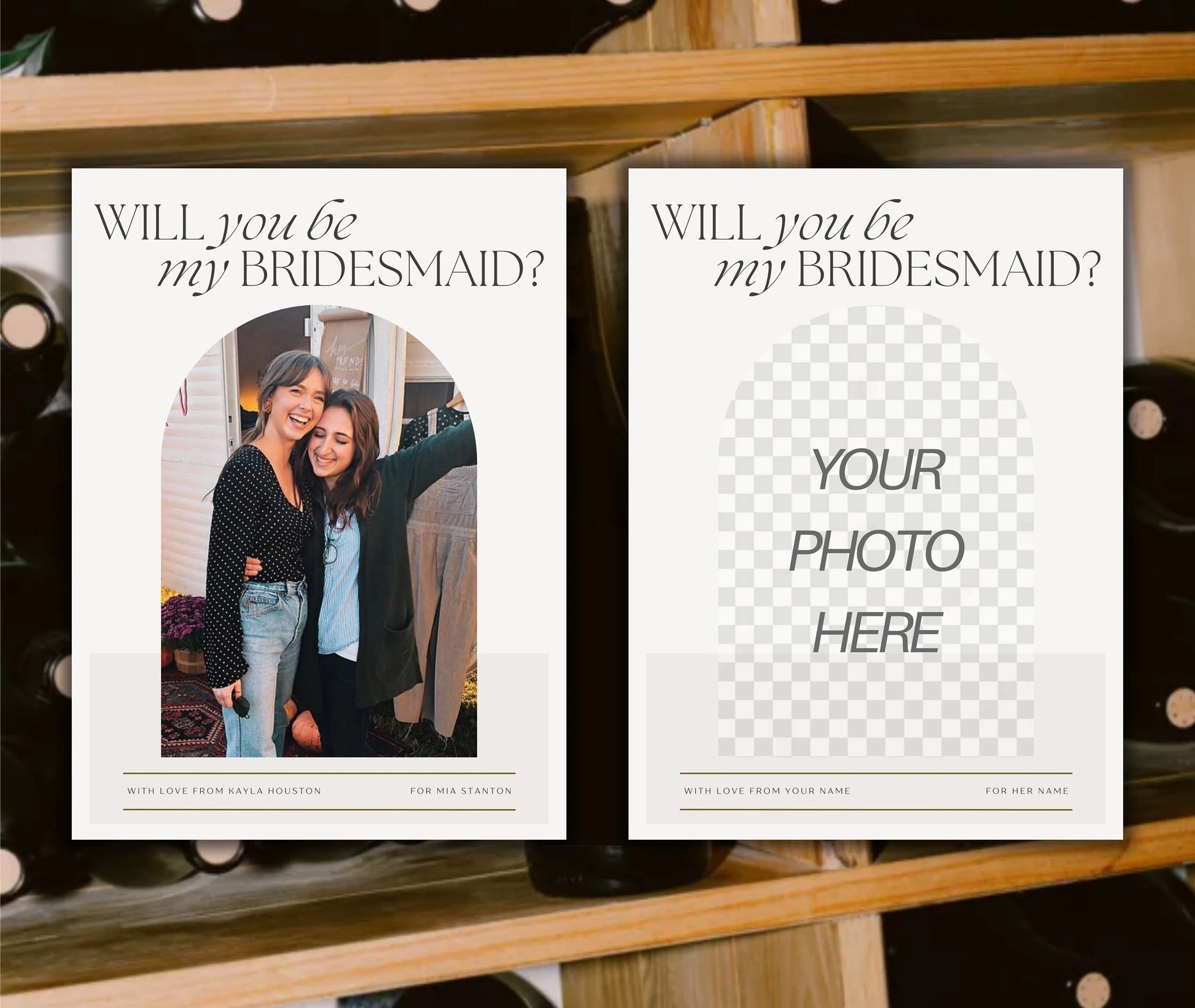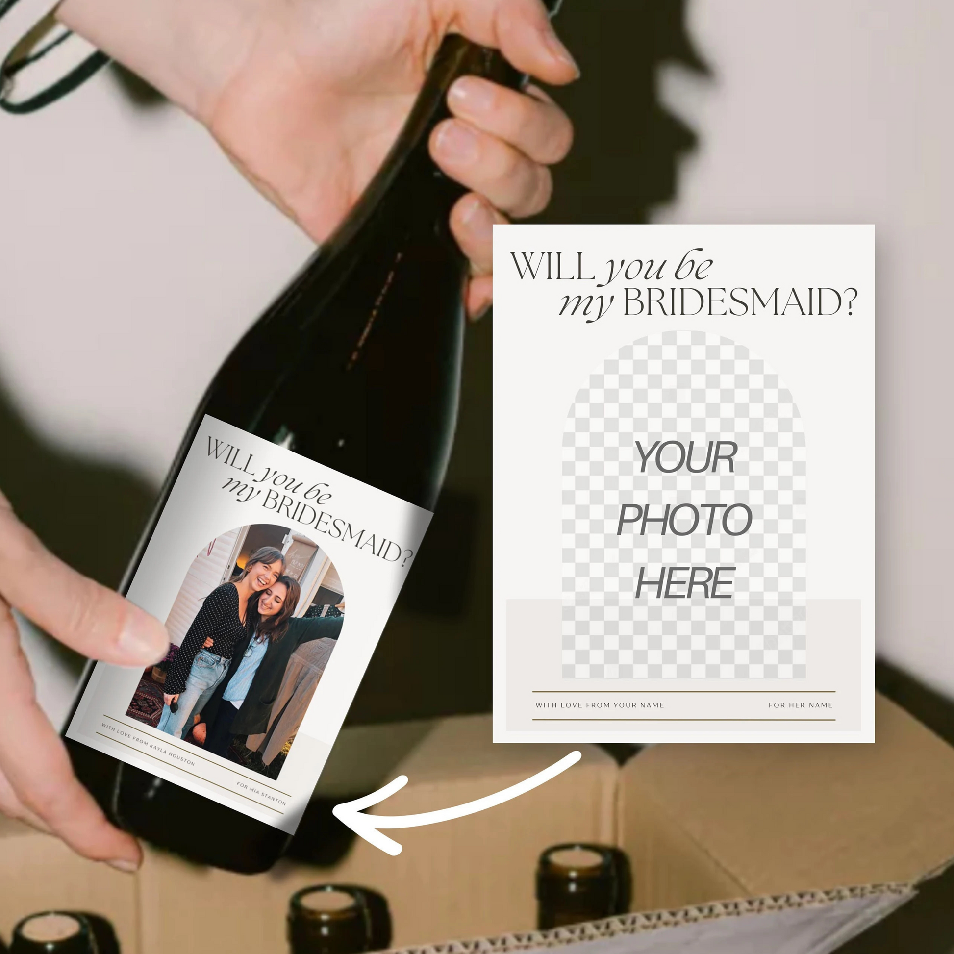 These custom wine, champagne, or liquor label stickers are made to order with your photo, your name, and your bridesmaid's name! Your custom label on a bottle is a perfect, sentimental way to ask your girlie to stand next to you on your big day. The waterproof sticker measures 3.5" x 4.75" and fits most 750ml bottles. Just remove the existing label on your bottle with warm, soapy water, and apply your custom label in its place.