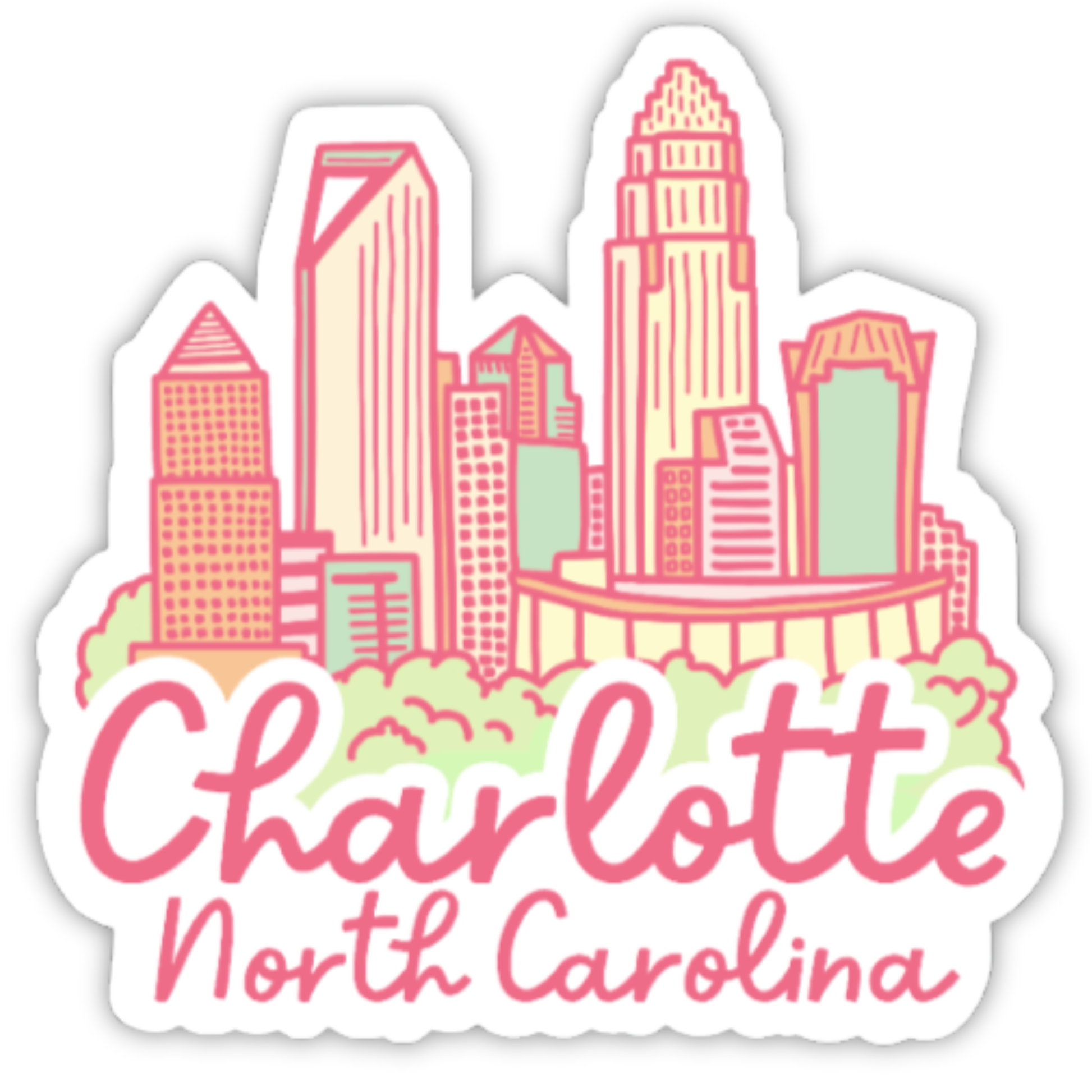 This Mini Charlotte Sticker Pack includes six color variations of the popular Charlotte Skyline design. These stickers are water resistant, weatherproof, and coated in a glossy laminate for a smooth to the touch feel.